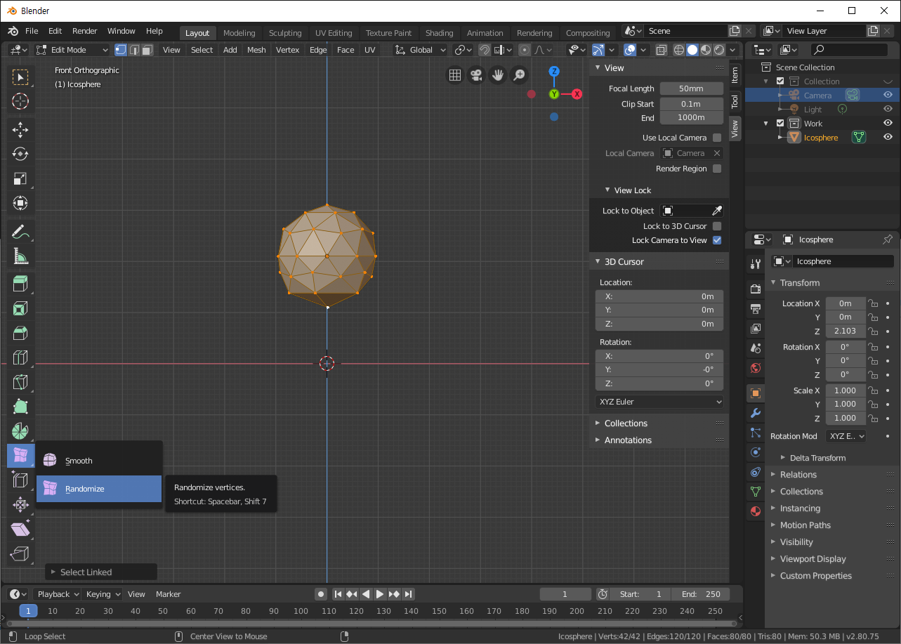 Randomize 기능으로 스피어를 울퉁불퉁하게 하고 버텍스로 모양을 만든 후