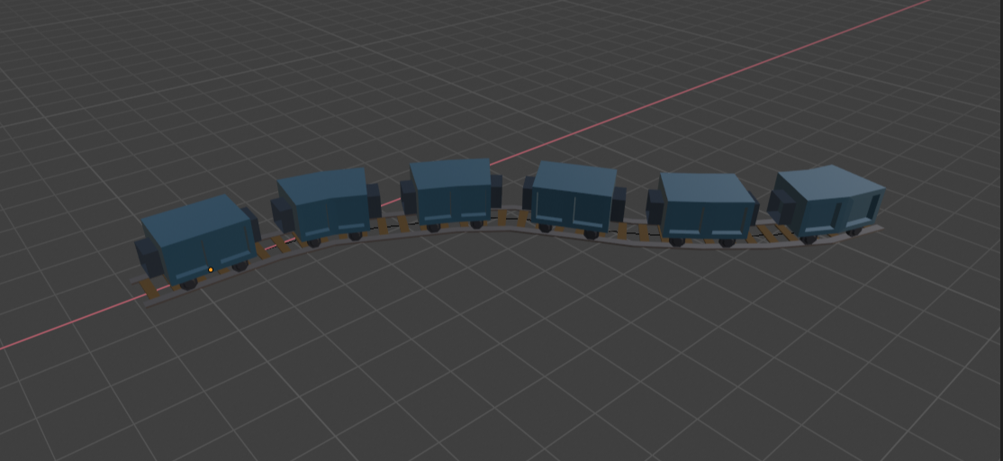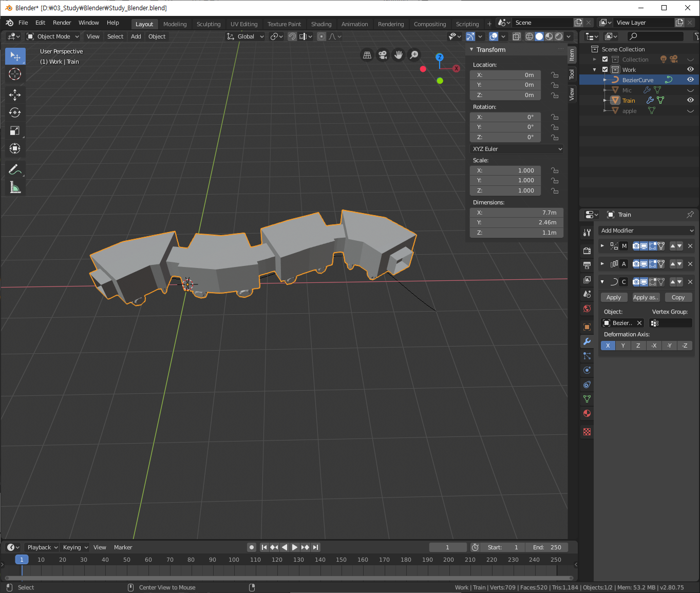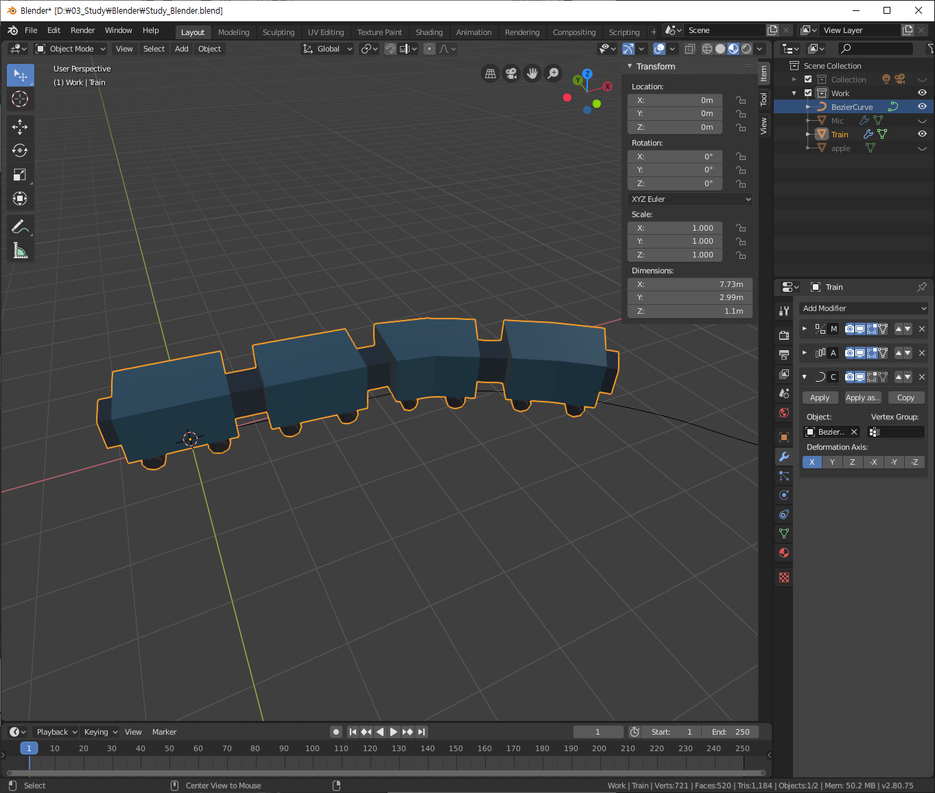 간단하게 열차모양을 준비했는데 Mirror Modifier가 적용되어 있는 상태 입니다.