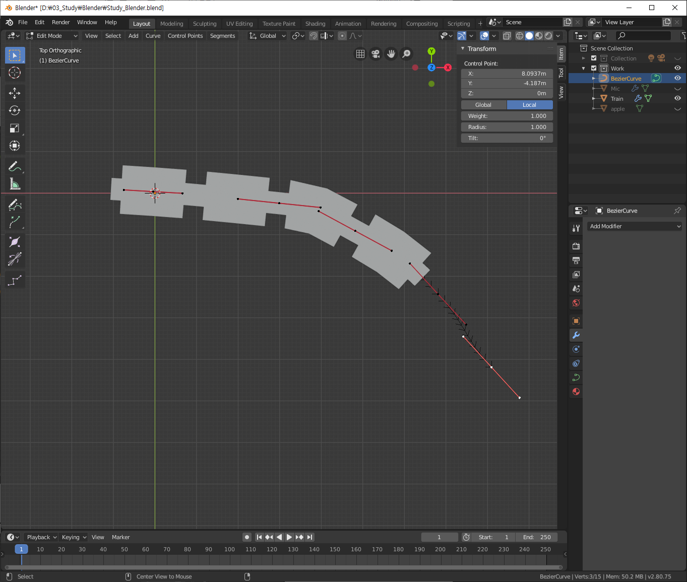 BezierCurve를 선택-Edit 모드로 들어가서 형태를 수정합니다.