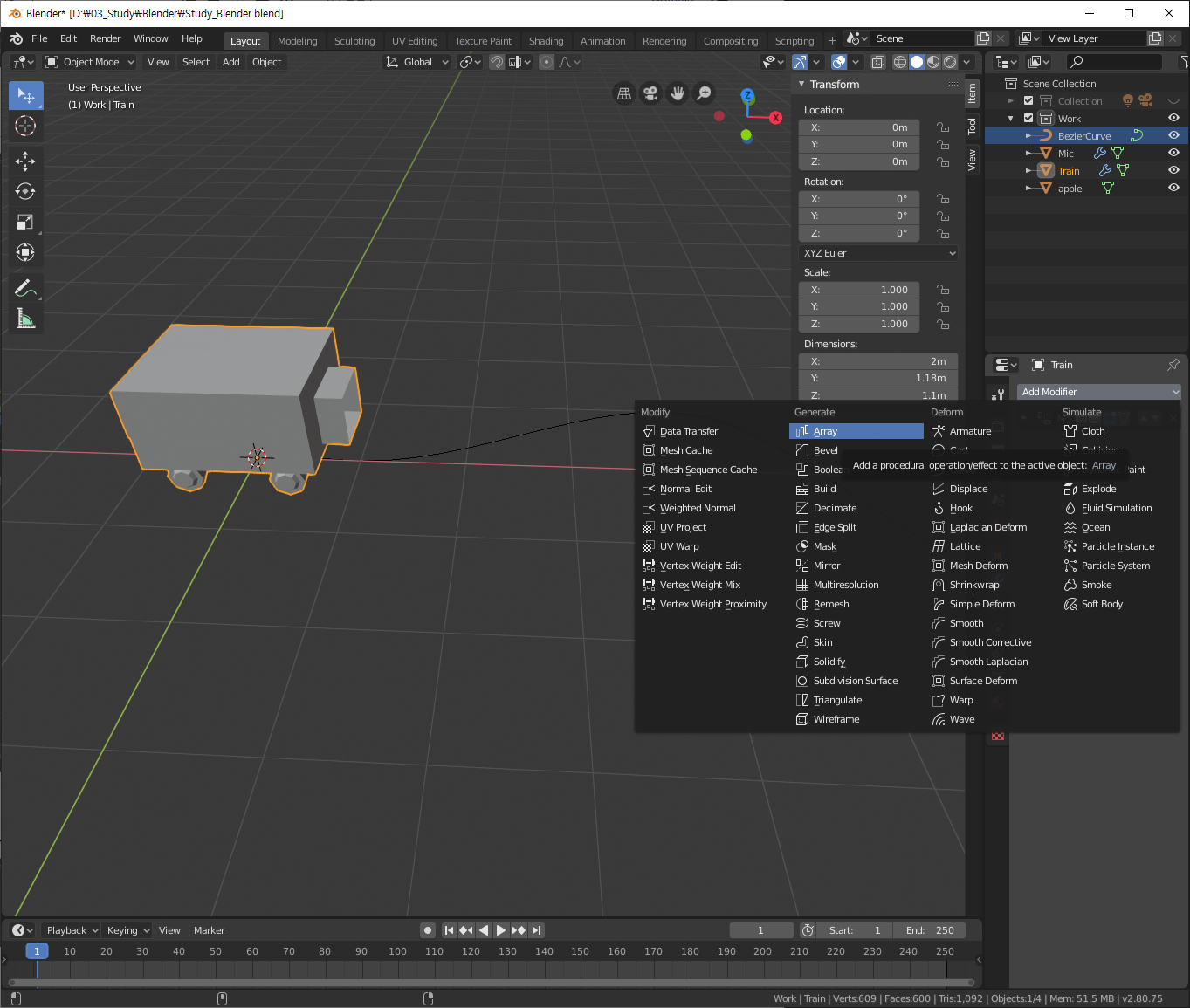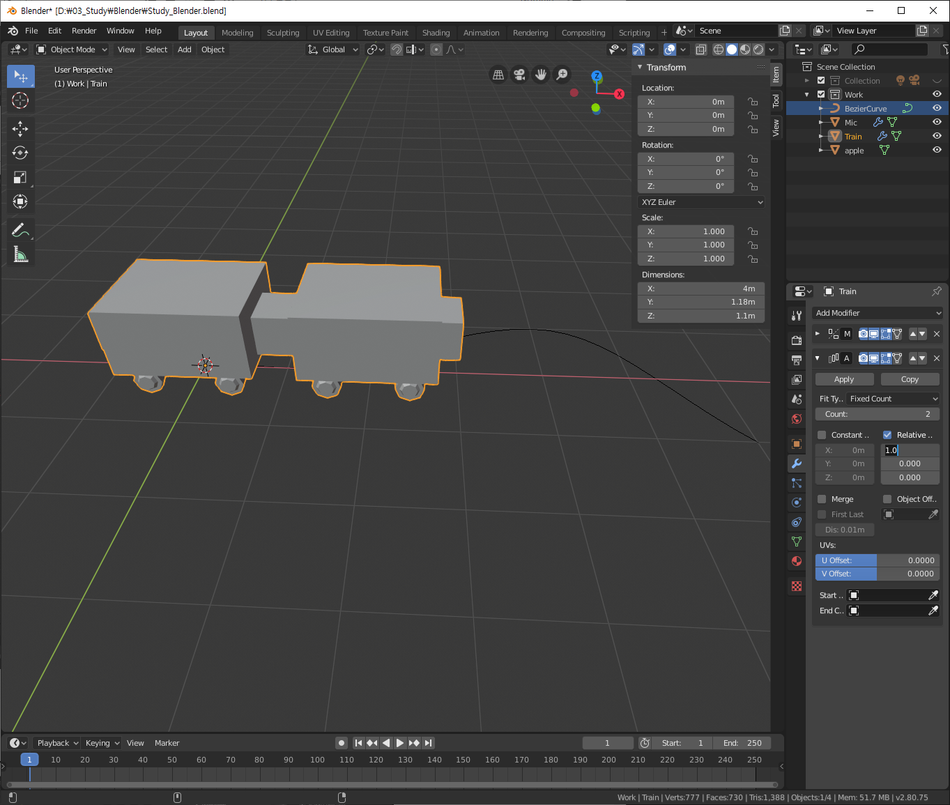 열차를 선택 한 후 Add Modifier - Array 를 적용합니다.