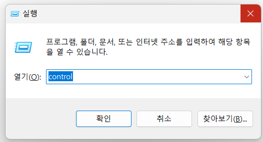 실행화면에서 control 을 입력하고 확인을 합니다.