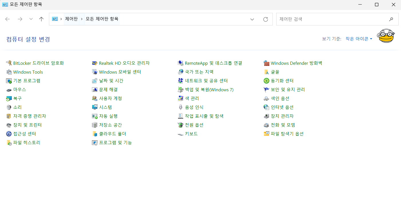 작은 아이콘 보기로 하면 위 스샷과 같이 모든 제어판 항목으로 보입니다.