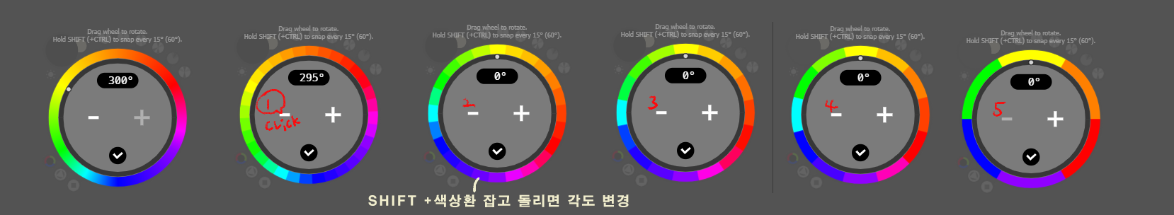 (휠만 돌려야지 가운데 -사각, 또는 삼각의 채도+밝기 부분을 건드리면 안 됩니다.)