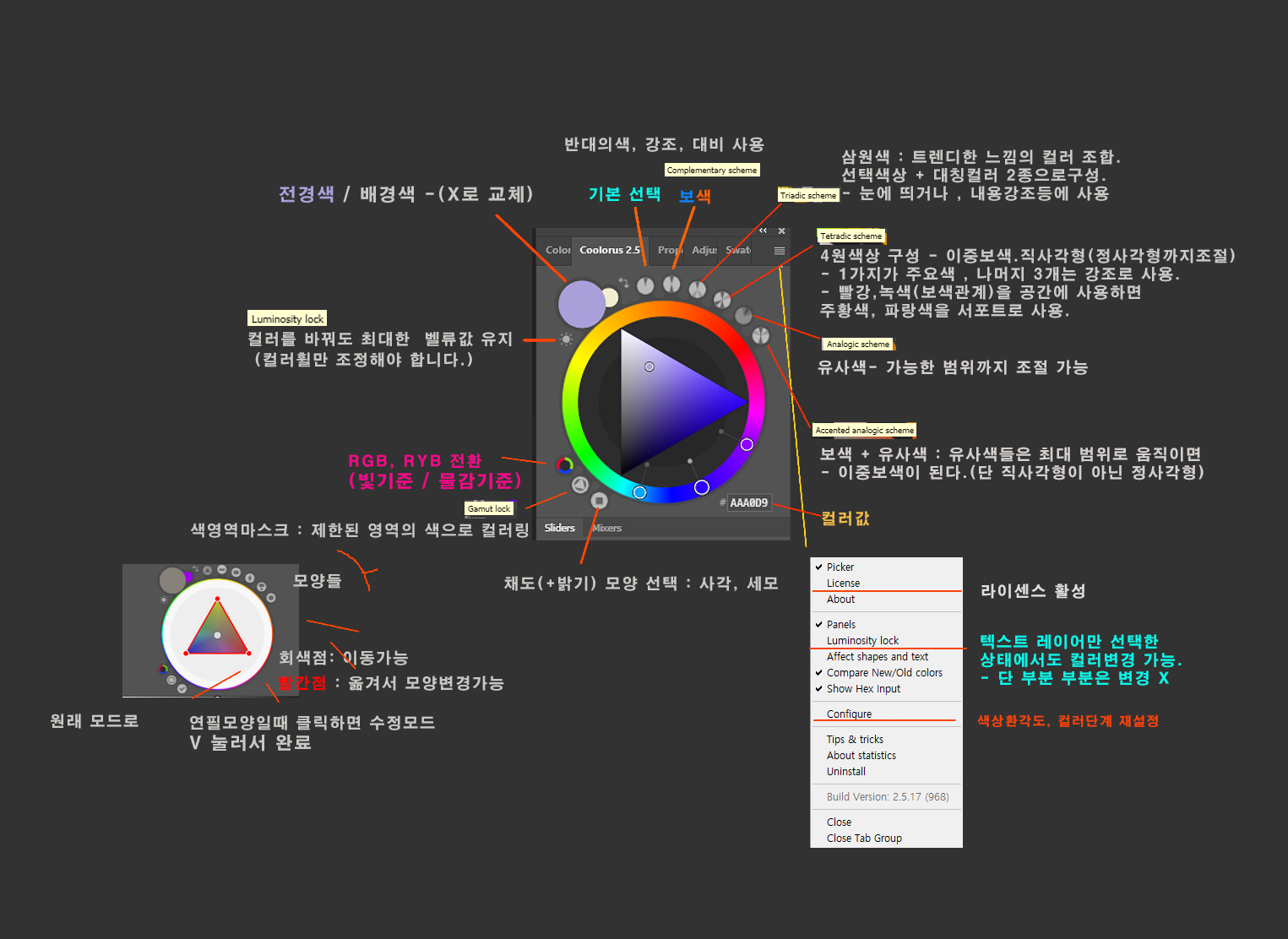 Scheme는 컬러스 휠에서 보색, 삼원색 등이 섞이는 컬러를 볼 수 있습니다.