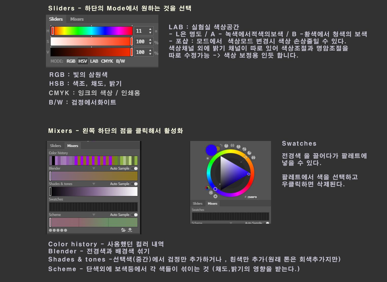 Mixers는 컬러의 믹스나 히스토리 등을 볼 수 있는데